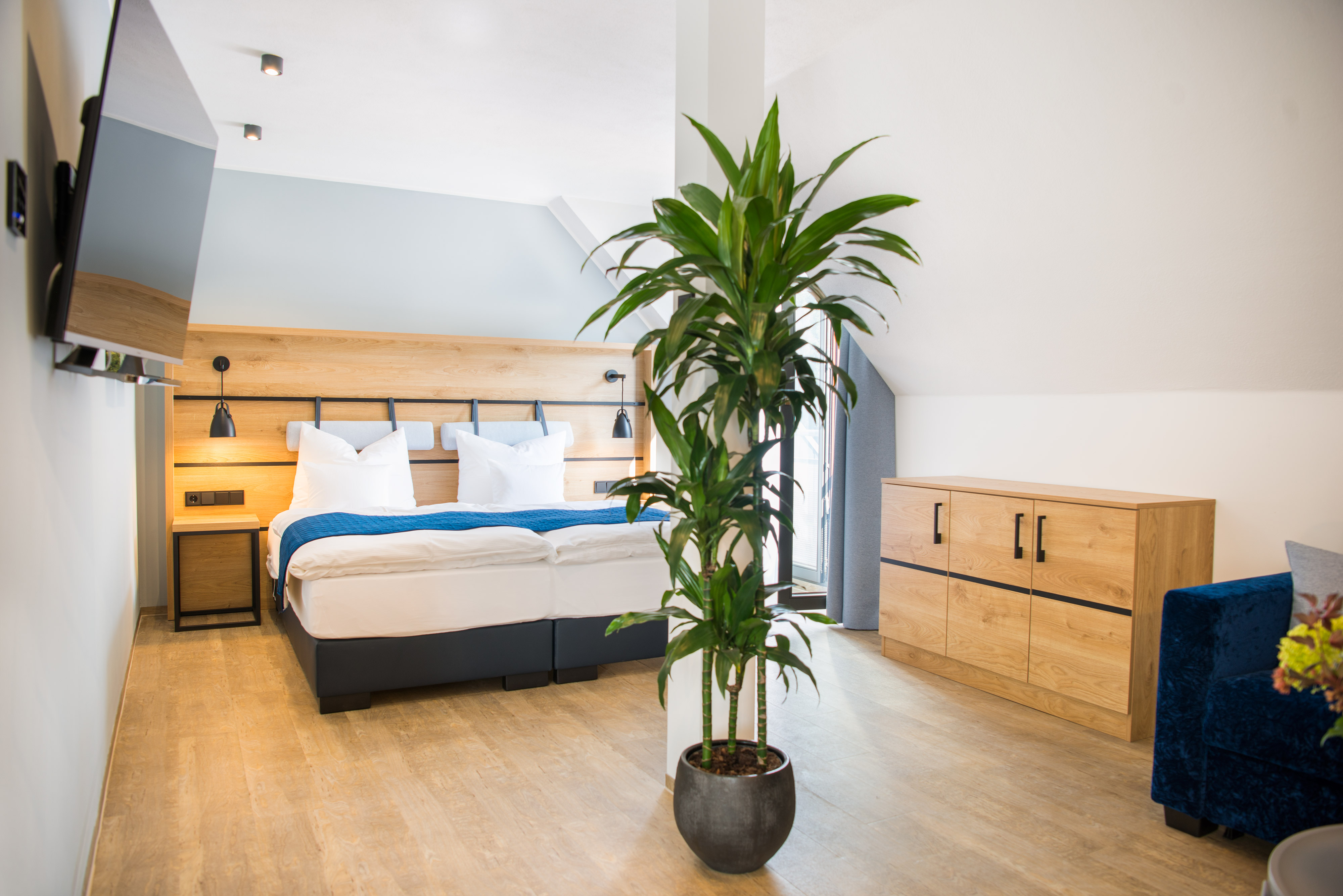 | Die großzügige und moderne Suite (ca. 46 m²) überzeugt mit getrenntem Wohn- und Schlafbereich, geeignet für 1-2 Erwachsene und 1-2 Kinder, die auf der Schlafcouch im Wohnbereich nächtigen. Besonders überzeugend das große Bad mit Dusche, WC und Föhn. Zur Ausstattung gehören Telefon mit digitaler Gästemappe, Flatscreen-TV, eine Kaffee- & Teestation und ein Schreibtisch. WLAN steht kostenfrei zur Verfügung. |